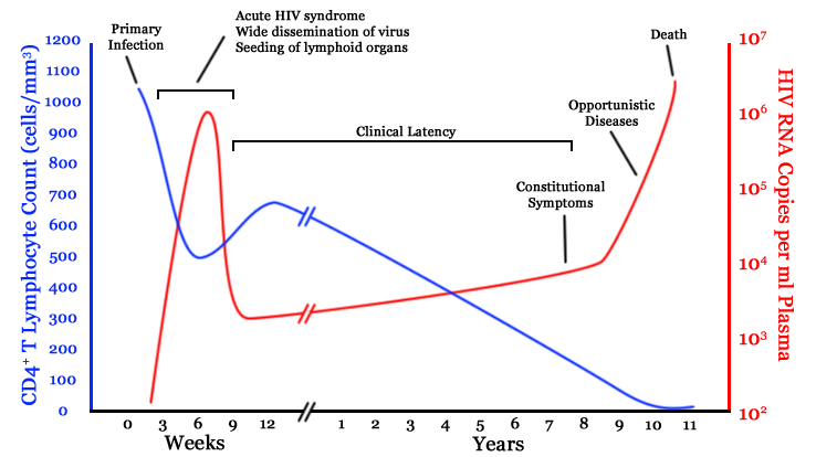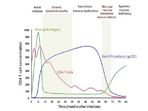 Viral Transmission (2-3weeks)--->early retroviral syndrome(2-3 weeks)----->Recovery & seroconversion-------> No symptom HIV infection ( average about 8 years)-------> AIDS (avg 1-2 years)-----> Death