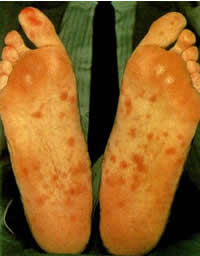 If left undiagnosed and untreated, the disease then progresses into the second stage marked by the development of a rash on the palms of the hands or on the soles of the feet. The rash does not itch. Sometimes the rash is so faint it is unnoticeable. Because of such symptoms, it is possible to have syphilis and not know it.